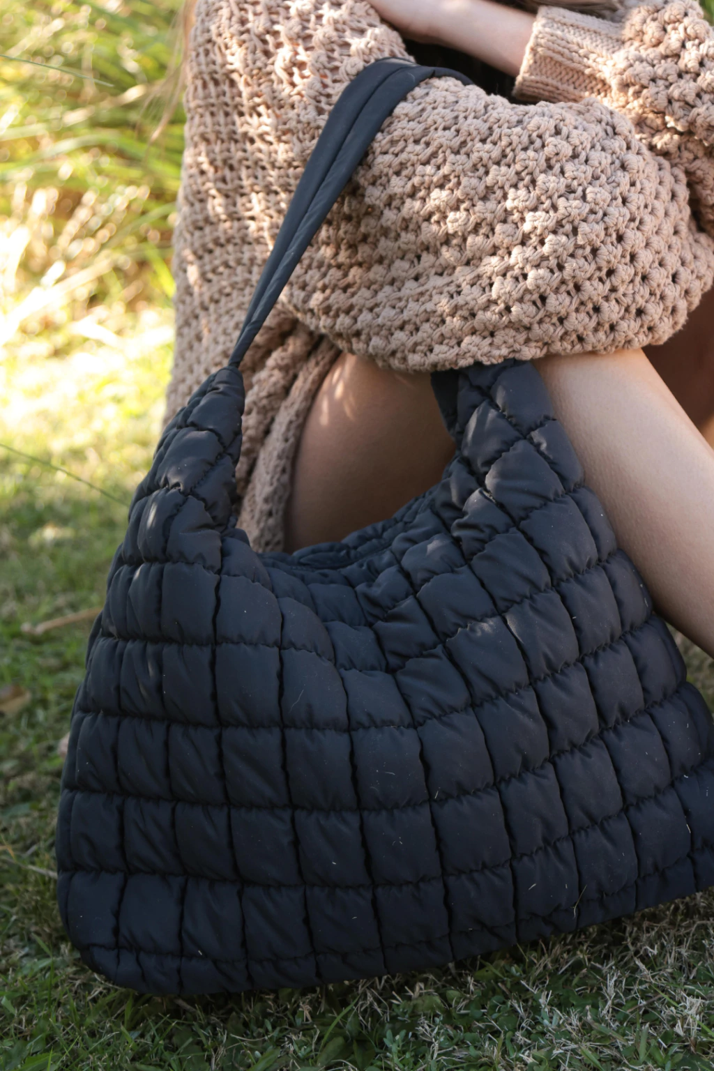 Bolso Flow, un accesorio que combina estilo y confort en un diseño de tendencia. Confeccionado en un moderno material acolchado en color negro, este bolso es ligero, suave al tacto y perfecto para el uso diario. Su compartimento principal se cierra de forma segura con una cremallera metálica, ofreciendo el espacio ideal para tus esenciales, haciéndolo la opción chic y práctica para llevar cómodamente al hombro.
