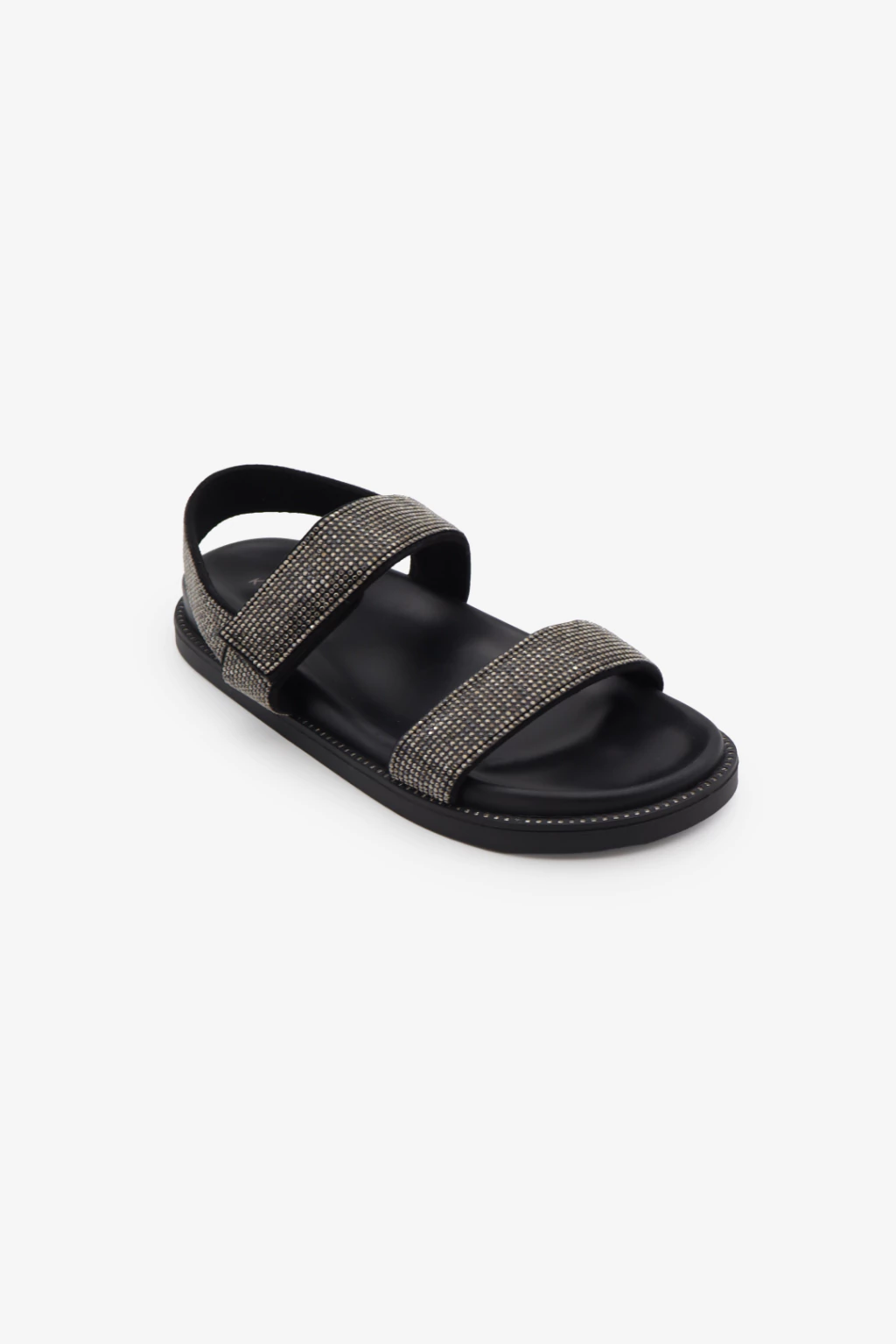 Sandalia Real, realizada en cuero sintético recubierto de piedras de strass, se ajustan con velcro en la parte superior de la capellada que facilitando el ajuste . El interior está forrado en cuero ecológico y posee suela antideslizante y una vira a tono con tachas niquel.